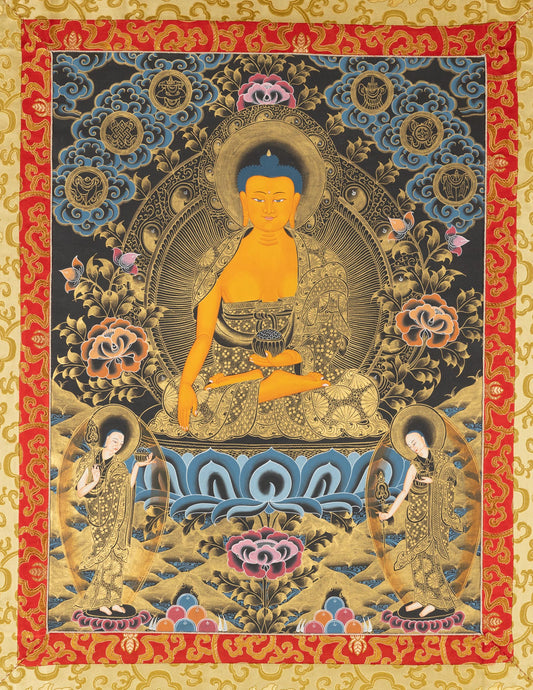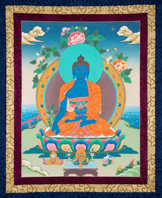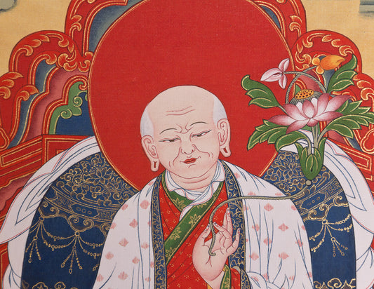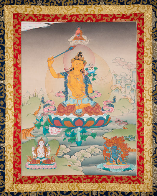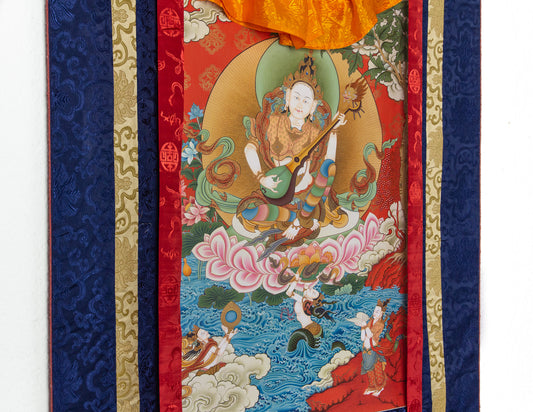 Das Thangka ist eine traditionelle Darstellung der buddhistischen Gottheiten, ihrer Attribute und des sie umgebenden Mandalas. Über Ihrem Schrein oder an Ihrem Praxisort dient es als Inspiration und Stütze für Ihre Meditation, Visualisierung und Sadhana-Praxis.