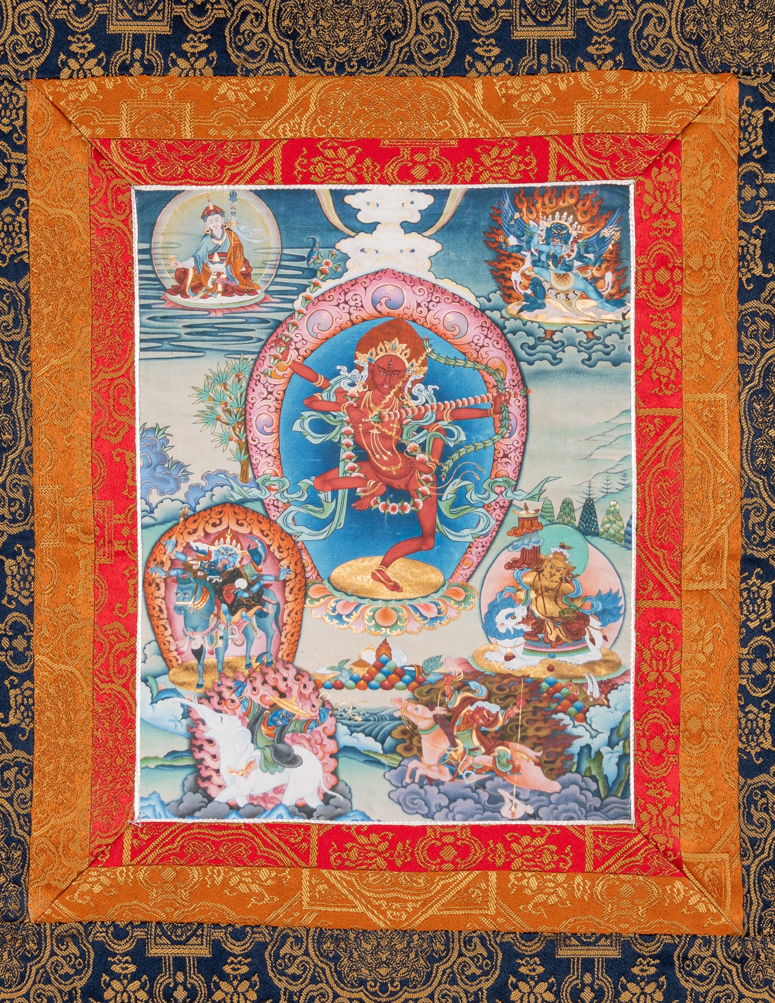 All of our thangkas are sourced directly from the makers in Nepal. The image is mounted into a textile frame of colourful Tibetan silk brocade, with a curtain for respectfully protecting when not in use.