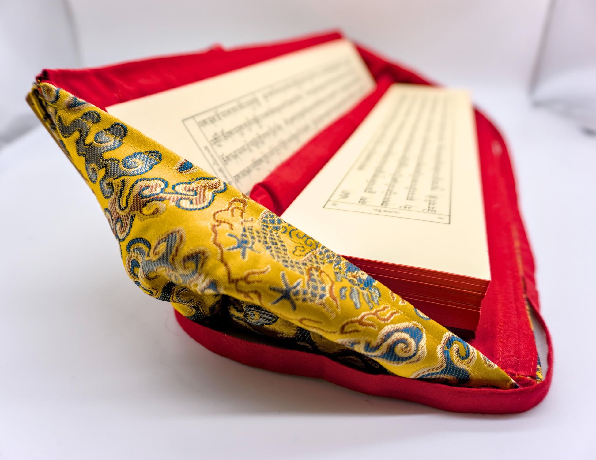 Hand-crafted in Nepal, our pecha-holders are made of high-quality natural unpainted bamboo that frames a colourful silk brocade exterior and a cotton cloth interior with a handy pocket to hold images of deities or notes. Open, the holder sits upright supporting your text while freeing your hands and allowing you to easily read through your practice. Closed, the holder conveniently stores your practice material between sessions, protecting it from dust, mishaps, dampness, and lost pages.