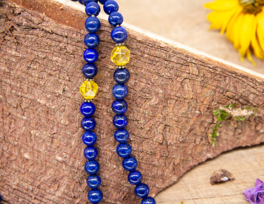 Mala en verre cristal lapis-lazuli et jaune 6mm