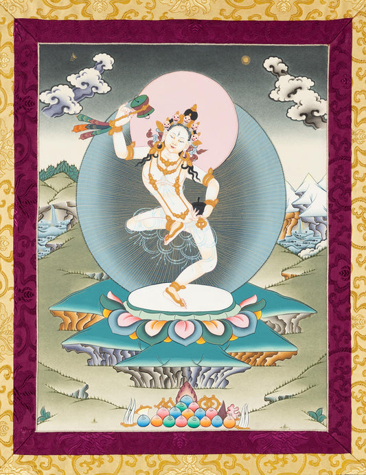 La Thanka est une représentation traditionnelle du Bouddha, des divinités bouddhistes, de leurs attributs et du mandala qui l'entoure. Affiché au-dessus de votre sanctuaire ou sur votre lieu de pratique, il sert d'inspiration et de support pour votre méditation, votre visualisation et votre pratique de la sadhana.