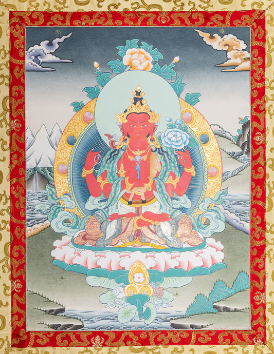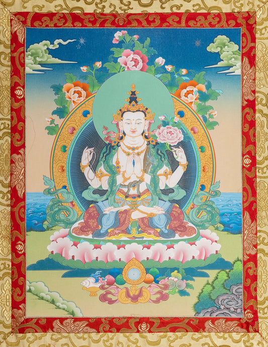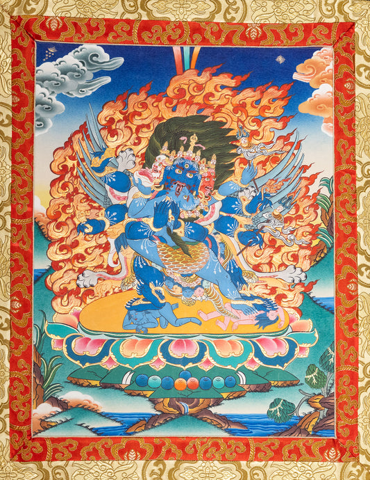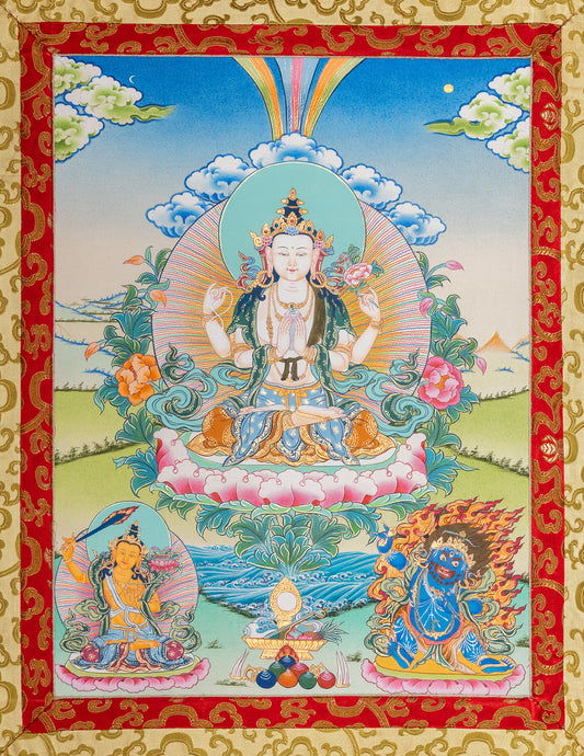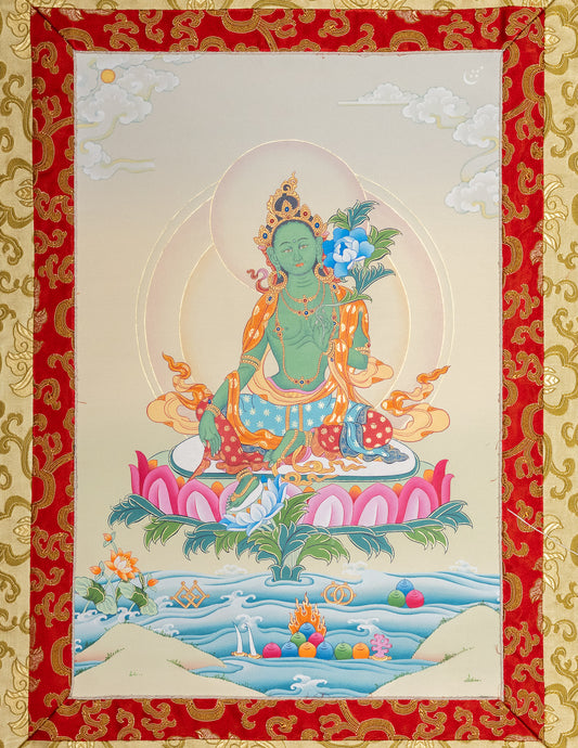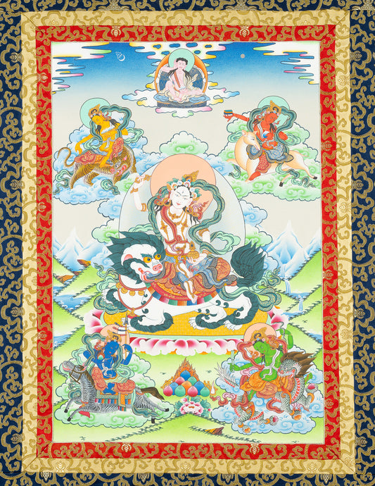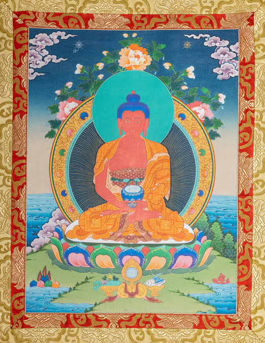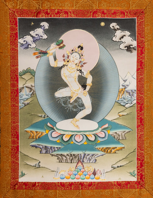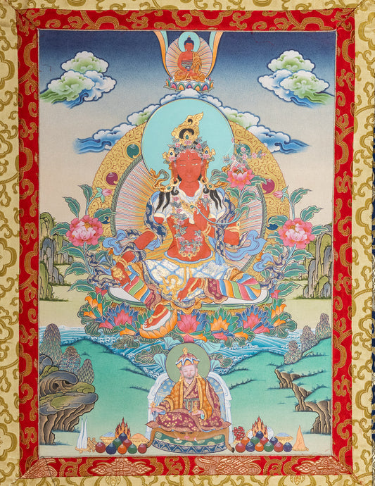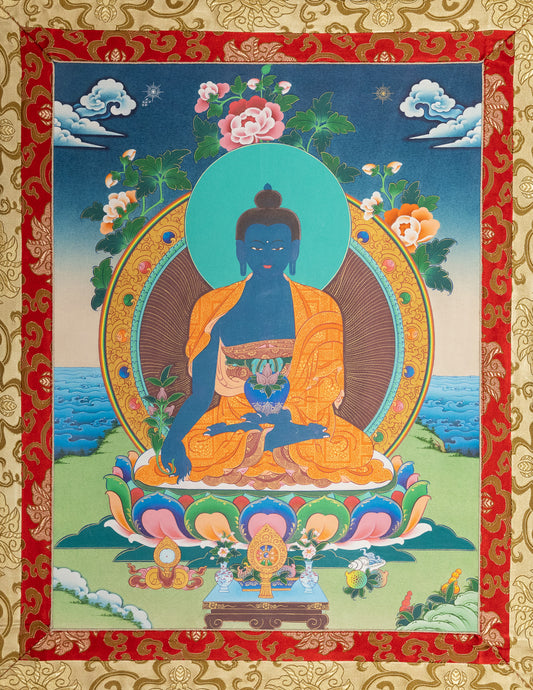 La Thanka est une représentation traditionnelle du Bouddha, des divinités bouddhistes, de leurs attributs et du mandala qui l'entoure. Affiché au-dessus de votre sanctuaire ou sur votre lieu de pratique, il sert d'inspiration et de support pour votre méditation, votre visualisation et votre pratique de la sadhana.