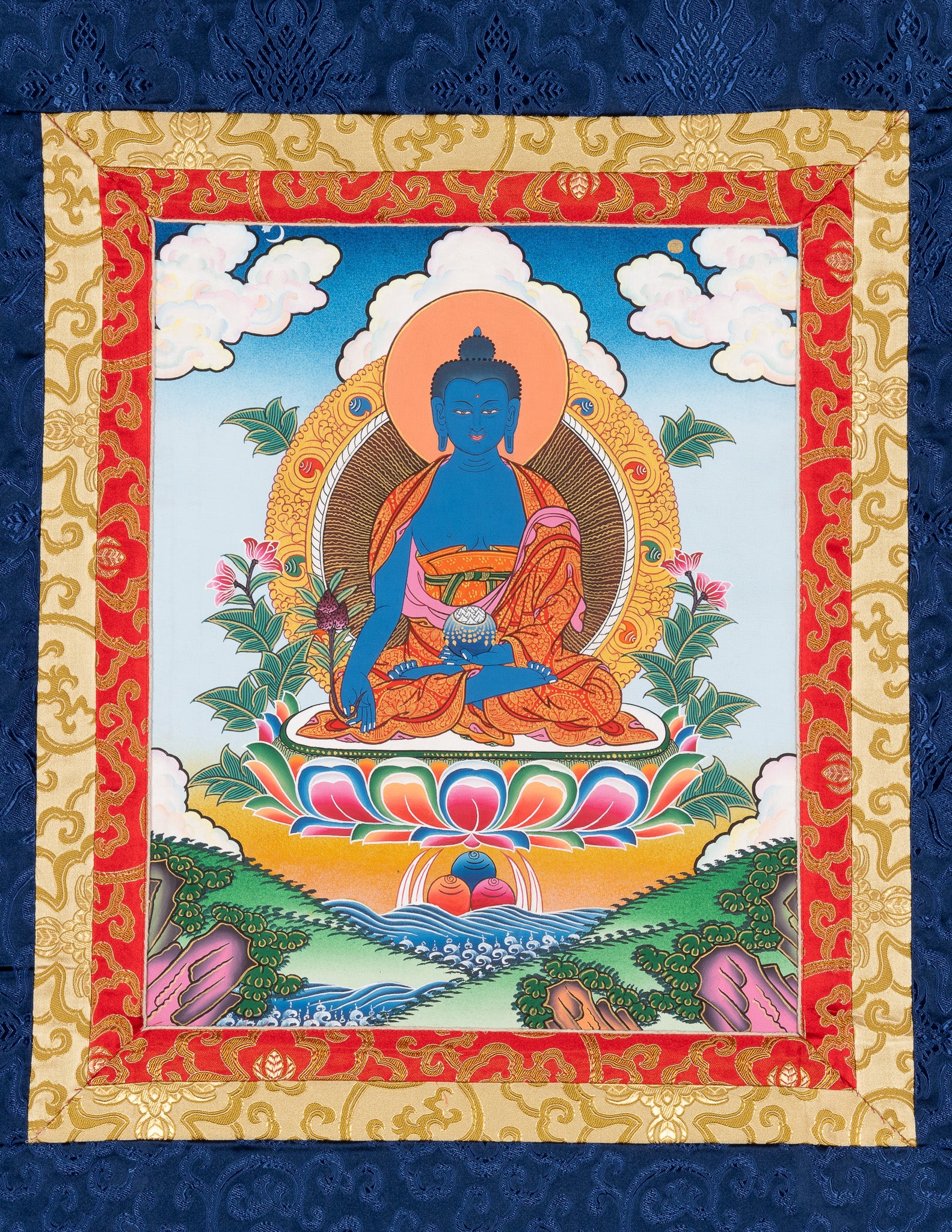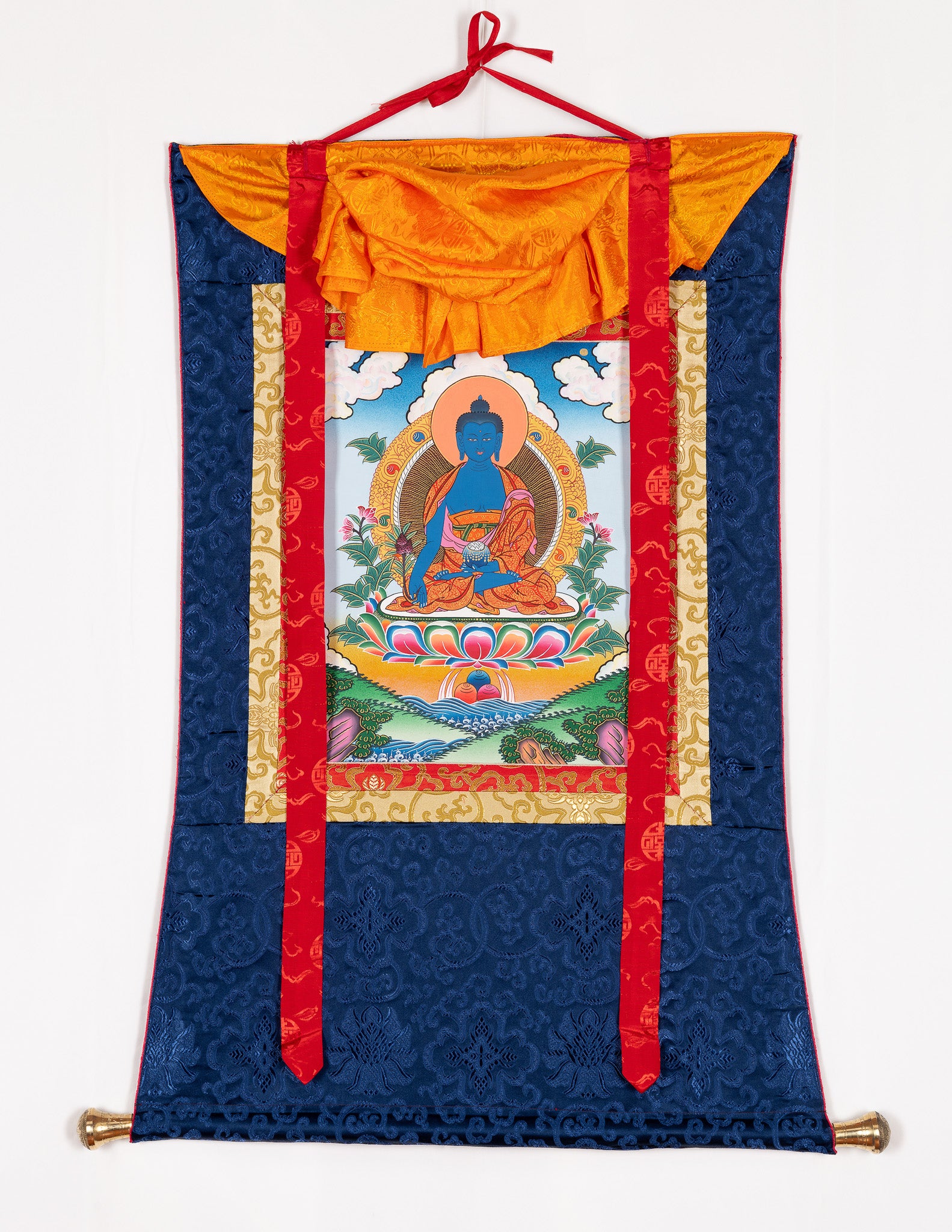 Tous nos thangkas proviennent directement des fabricants du Népal. L'image est montée dans un cadre textile en brocart de soie tibétain coloré, avec un rideau pour la protéger respectueusement lorsqu'elle n'est pas utilisée.