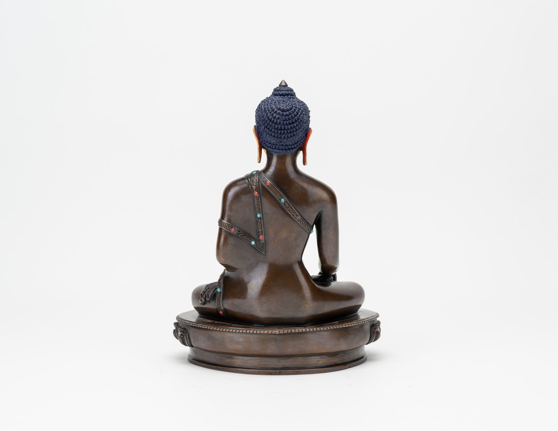 Statue finement ouvragée du Bouddha Shakyamuni en cuivre oxydé. Le visage est délicatement peint à la main avec un pigment d'or pur.