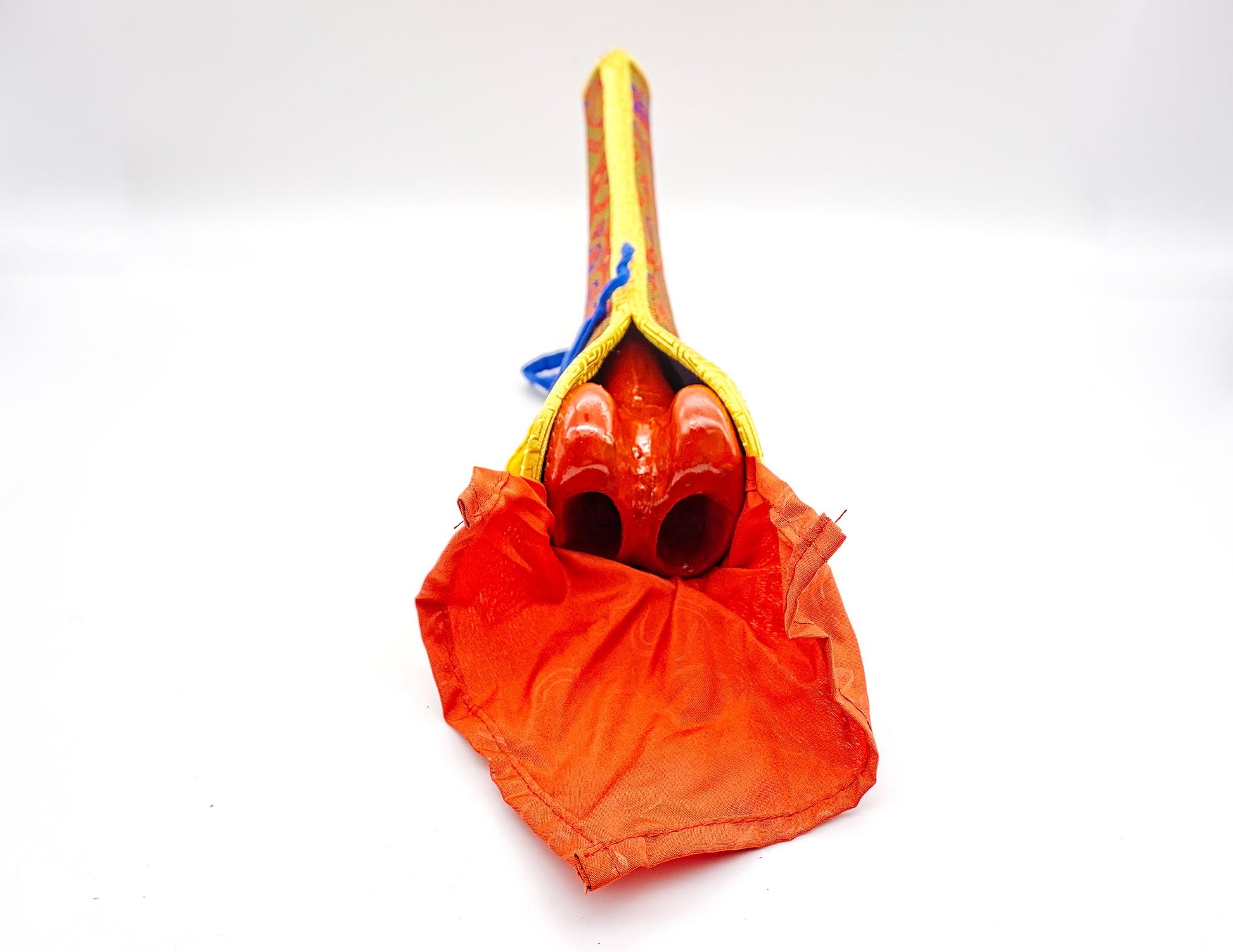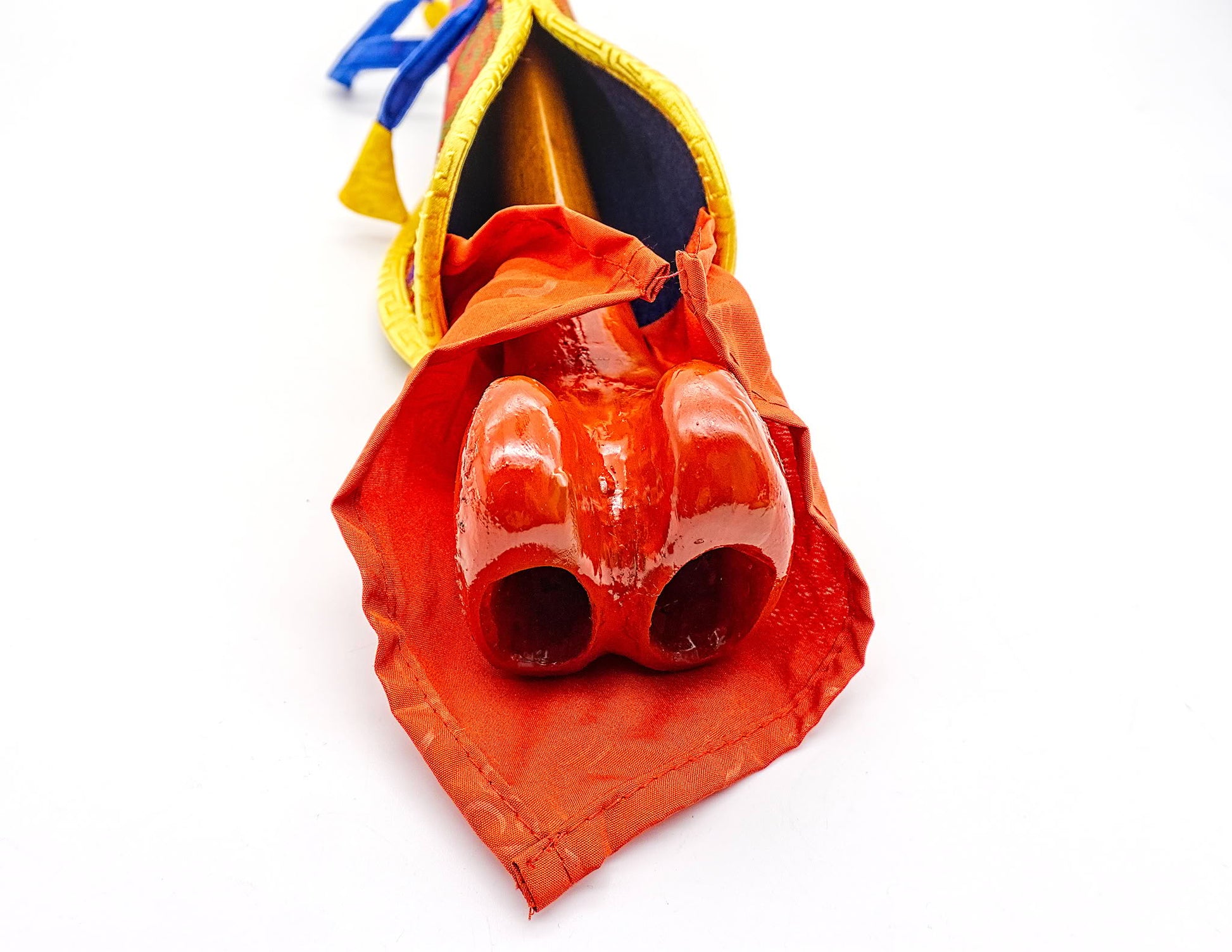 Wrathful deities are said to be delighted by the haunting sound of the instrument, while malicious spirits are enticed yet thereby divested of their mischievous influence. Due to current export restrictions in the Himalayan region regarding human bone, our supply of kanglings are composed of high quality wood or resin with a veneer of red shellac to mimic authenticity. Nevertheless, they perfectly resemble the traditional human femur trumpets, and produce an impressive sound.