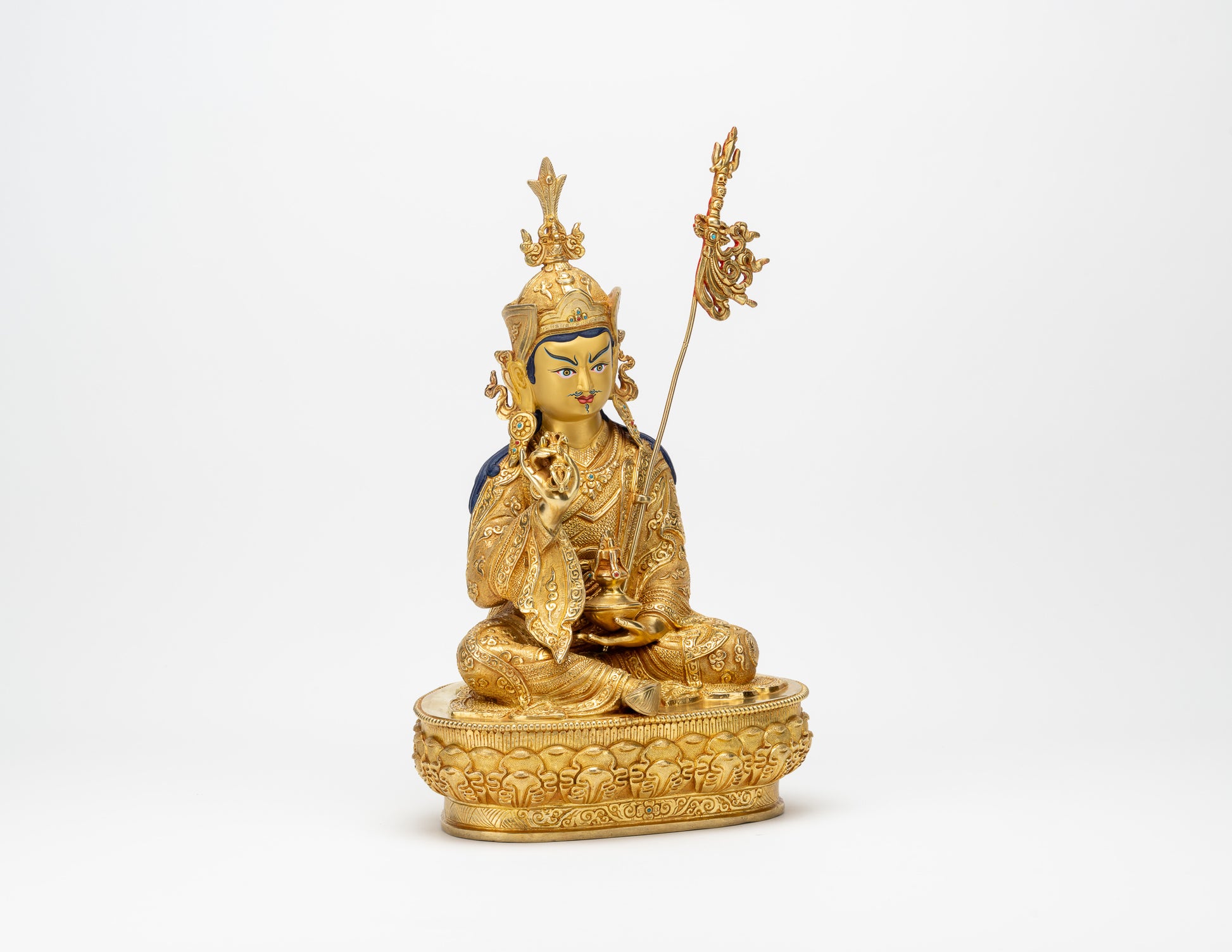 Präzise gefertigte Kupferstatue von Guru Rinpoche, vollständig mit Gold überzogen. Das Gesicht ist sorgfältig von Hand mit reinem Goldpigment bemalt.