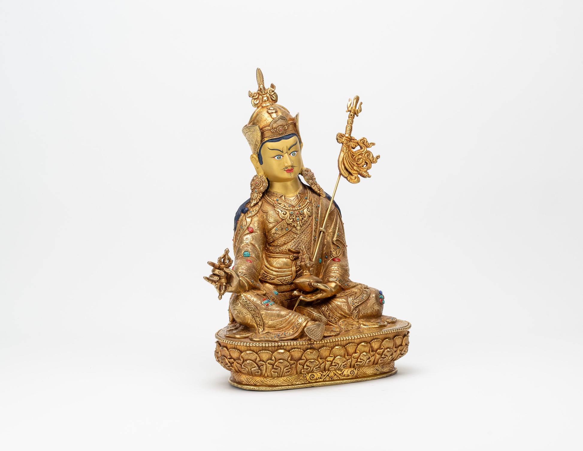 Präzise gefertigte Kupferstatue von Guru Rinpoche, vollständig mit Gold überzogen. Das Gesicht ist sorgfältig von Hand mit reinem Goldpigment bemalt.
