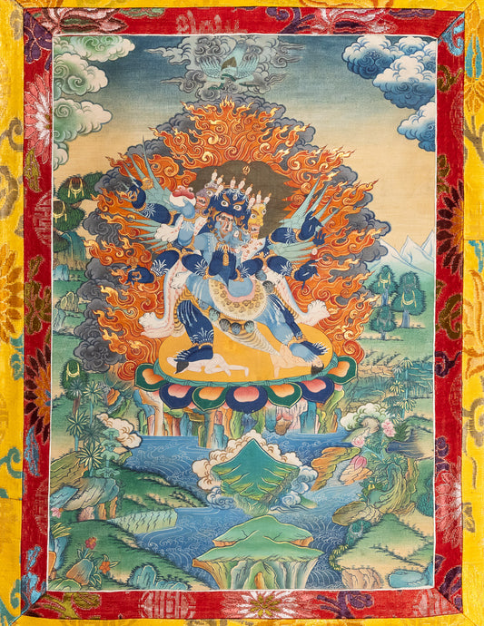 | Mahakala | Mahakala ist einer der wichtigsten Schutzgottheiten des tantrischen Buddhismus. Er erscheint entweder schwarz oder dunkelblau, mit zwei, vier oder sechs Armen und ist die zornige, mächtige, erleuchtete Emanation von Avalokistesvara, dem Herrn des Mitgefühls. |