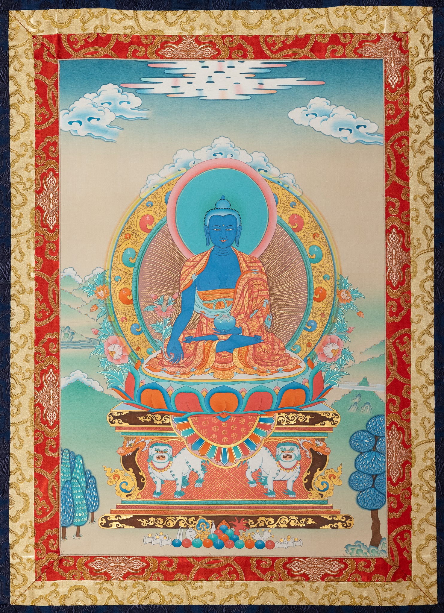 Alle unsere Thangkas werden direkt von den Herstellern in Nepal bezogen. Das Bild ist in einen Textilrahmen aus farbenfrohem tibetischem Seidenbrokat eingefasst, mit einem Vorhang zum respektvollen Schutz, wenn es nicht verwendet wird.