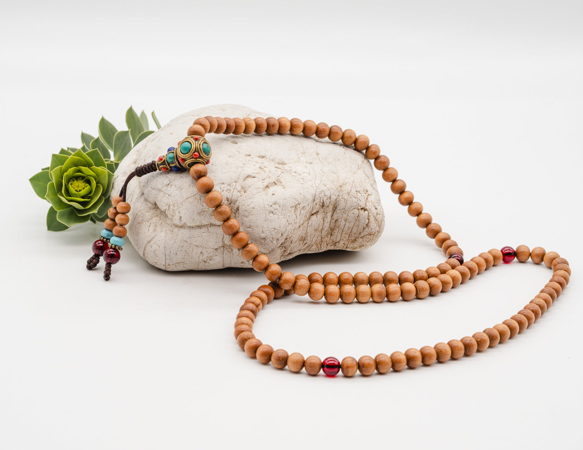 This mala features 108 fragrant sandalwood beads and red spacer beads.