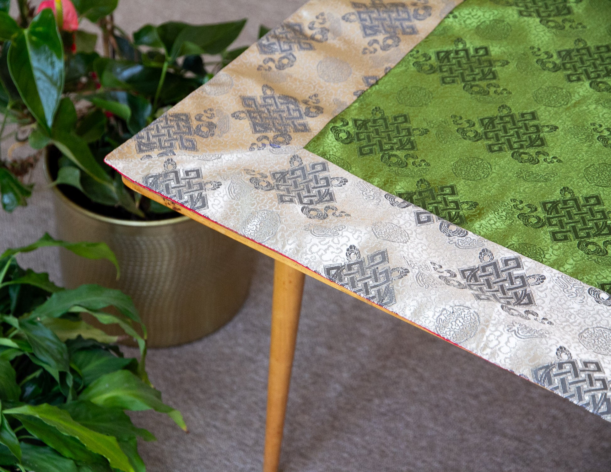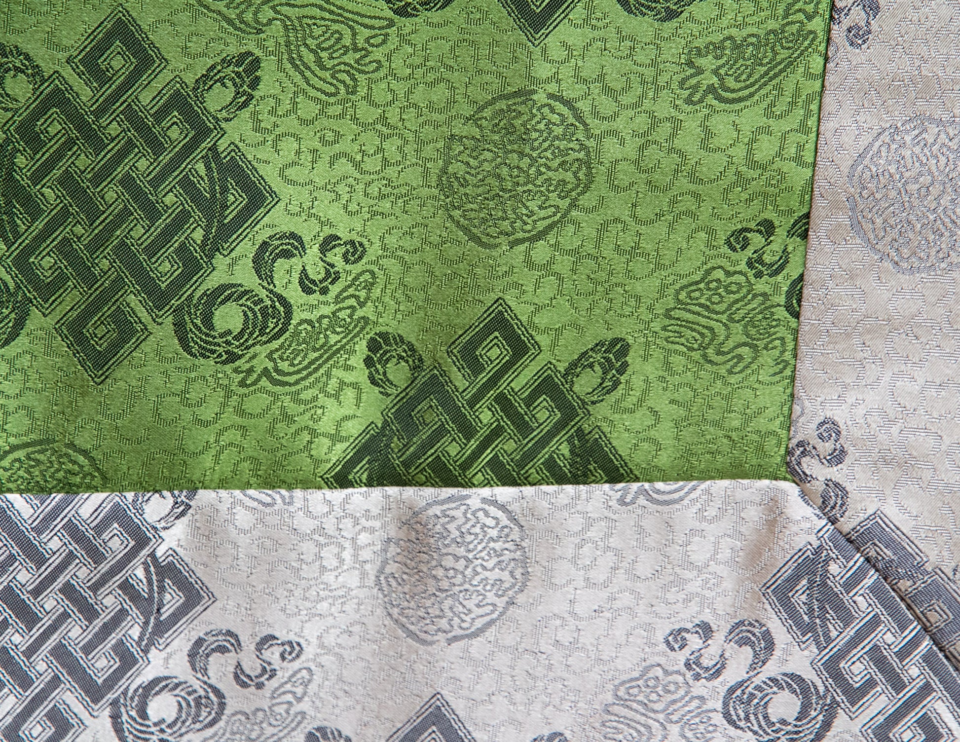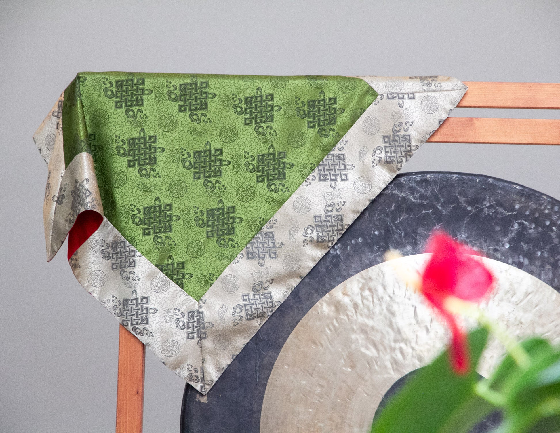 Brokattücher dienen als besondere Tischsets in der idealen Größe, um einen Schrein zu schmücken oder Ihre wertvollen Texte und Ritualinstrumente darauf zu platzieren. Um einen exotischen Hauch von Tibet oder dem Orient zu bringen, können Läufer auch verwendet werden, um jeden Tisch oder jede Oberfläche in Ihrem Zuhause zu dekorieren.